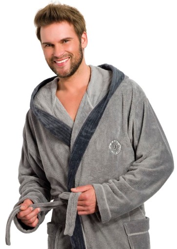 Szlafrok męski z kapturem, wiązany w pasie, z miękkiej dzianiny (soft), na biodrach kieszenie zewnętrzne, na wysokości klatki piersiowej naszyta aplikacja. Miły i przyjemny w dotyku, gwarantuje komfort noszenia.