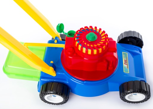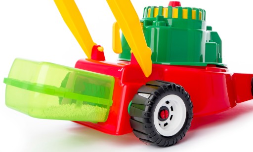 Wykonana z trwałego tworzywa zabawka ma również ruchome koła i wygodną, składaną rączkę z blokadą wysokości. Po skończonej zabawie blokadę (dwa ruchome zaczepy) można zwolnić i złożyć rączkę. Dzięki temu kosiarka jest łatwa do przechowywania i nie zajmuje dużo miejsca w dziecięcym pokoiku. Można ją również zabrać w podróż. Idealna do zabawy w domu, w ogrodzie lub na podwórku.