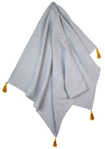 Otulacz jest wykończony ozdobnymi frędzelkami