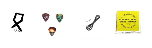 PASEK GITAROWY, KOSTKI DO GRY, KABEL 3 METROWY, KLUCZE DO REGULACJI ORAZ KOMPLET STRUN