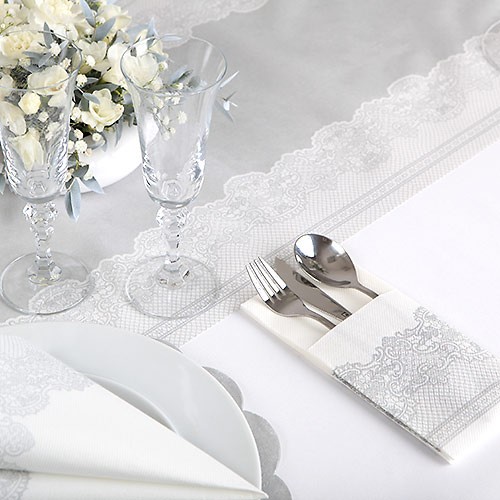 - flizelinowe kieszonki na sztućce w białym kolorze zdobione srebrnym motywem
