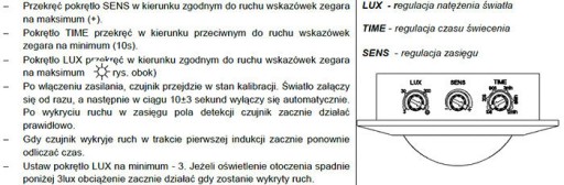 -regulowany czas załączania TIME – Minimalny czas to 10 sek±3 sek. Maksymalny czas to 12 min ±1 min. Czas liczony jest od ostatniej detekcji