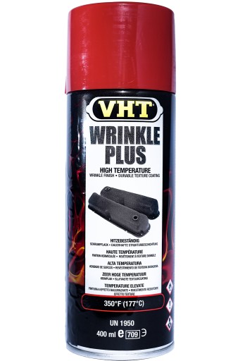 VHT Wrinkle Plus™ łączy w sobie intensywne kolory z ciekawą i niestandardową fakturą w celu osiągnięcia nietypowego wyglądu. Jest odporny na temperaturę do 350°F (177°C) i idealnie nadaje się do malowania wszystkich powierzchni metalowych. VHT Wrinkle Plus™ jest odporny na blaknięcie koloru, smary, rozpuszczalniki i trudne warunki pogodowe. Jednocześnie wykonana powłoka jest niezwykle trwała i odporna na rdzę, korozję, odpryski i pęknięcia.