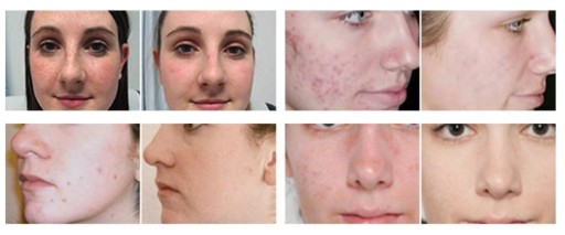 Kolor niebieski (430-450nm): pomaga wyleczyć istniejące zmiany trądzikowe i zapobiega powstawaniu nowych, przez niszczenie bakterii P.acne. Reguluje pracę gruczołów łojowych i obkurcza rozszerzone pory.