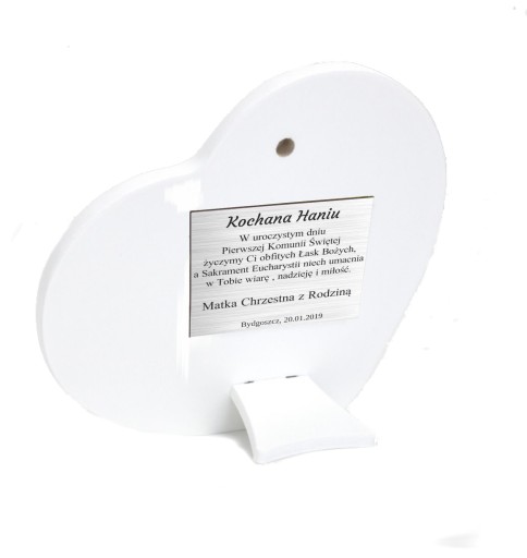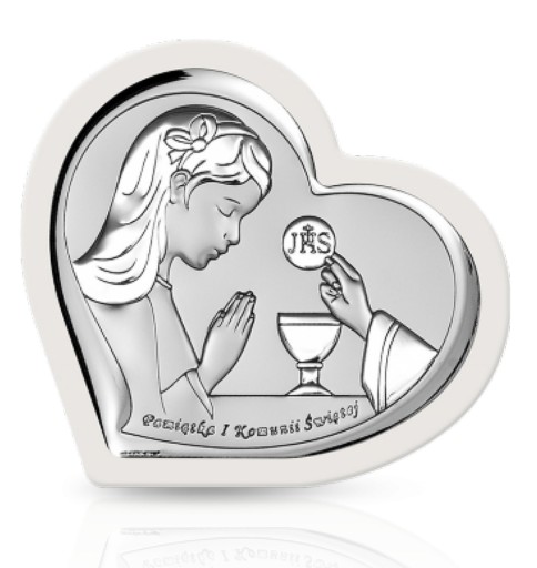 Pamiątka włoskiej firmy BELTRAMI przedstawiająca wizerunek Dziewczynki przystępującej do przyjęcia sakramentu Pierwszej Komunii Świętej . Całość została zamknięta w kształcie klasycznego serca z napisem " Pamiątka I Komunii Świętej " Obrazek został osadzony na białym drewnie. Dzięki wkładanej podpórce obrazek możemy umiejscowić na komodzie lub powiesić na ścianie.