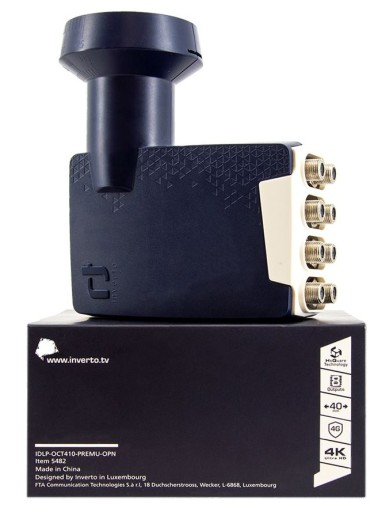 Wysokiej jakości konwerter luksemburskiej marki Inverto. Konwerter typu OCTO służy do odbioru sygnału z jednego satelity, posiada osiem niezależnych wyjść pozwalających na podłączenie ośmiu tunerów pojedynczych (jednogłowicowych), lub czterech tunerów dwugłowicowych PVR. Posiada osłonę przeciwdeszczową.