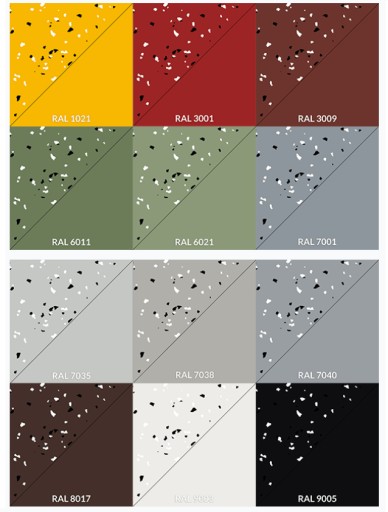 Dostępne kolory: RAL: 1001, 1011, 3009, 6021, 7001, 7030, 7032, 7040, 7045, 7046, 7047, 1021,1015, 6001, 6011, 7035, 8017, 9003, 9005, 5024, 3001, 5023, 7024, 7038