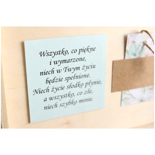 Na wewnętrznej stronie otwieranego wieczka umieszczono wierszyk (życzenia urodzinowe dopasowane do wieku) oraz kieszonkę, w której mieści się tag na sznurku (do samodzielnego podpisu, do personalizacji). np.: Sylwii, Matka Chrzestna Dominika; Jakubowi siostra Iza z mężem.