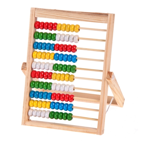 Kolorowe liczydło składające się z 10-rzędów kolorowych koralików, w całości zostało wykonane z drewna.