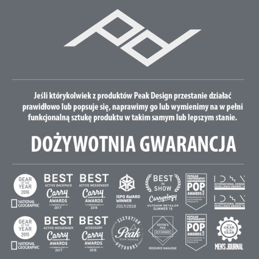 Produkty Peak Design charakteryzują się nie tylko świetnym wykonaniem i przemyślaną konstrukcją. Ich wytrzymałość jest wręcz legendarna, a najlepszym potwierdzeniem tej tezy jest fakt, iż producent udziela na produkt dożywotniej gwarancji.