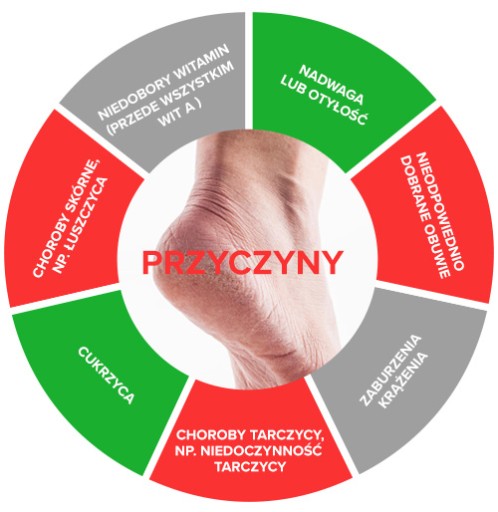 Powodów pękających pięt jest wiele, a zima potrafi tylko zaostrzyć objawy choroby. Nasze stopy każdego dnia są narażone na różnego rodzaju urazy, otarcia i odciski, dlatego wymagają codziennej, specjalistycznej pielęgnacji. Skóra pięt jest grubsza od tej w innych partiach ciała i podlega ciągłemu procesowi złuszczania się i odnowy. Często zdarza się, że mimo naszych starań dochodzi do jej znacznego zgrubienia, skóra narasta dużo szybciej, a proces jej złuszczania jest opóźniony. Konsekwencją jest nadmierne rogowacenie i utracenie naturalnej elastyczności, czego skutkiem jest bolesne pękanie pięt.