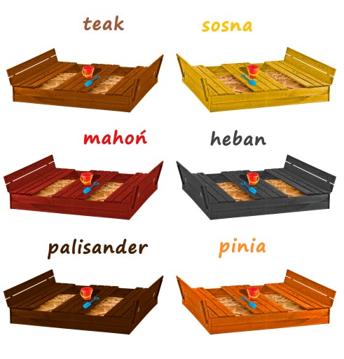 Do wyboru 6 kolorów atestowanej farby dekoracyjno - ochronnej zgodnej z normą bezpieczeństwa zabawek EN 71-3. Piaskownica jest do samodzielnego pomalowania. W skład zestawu wchodzą: piaskownica do samodzielnego montażu (częściowo zmontowana; w elementach), wkręty, instrukcja.