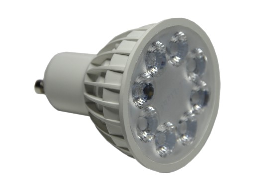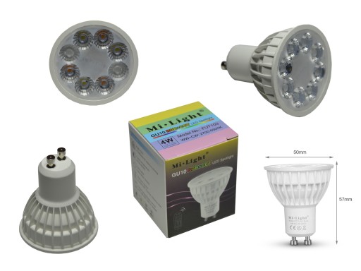 żarówkę SMART LED RGB+CCT WiFi GU10 230V MiLight FUT103 o możliwości wyświetlenia dowolnego koloru (dostępne 16 mln kolorów z palety RGB), również dowolnego światła białego z przedziału 2700-6500 K, o mocy 4W z uchwytem GU10, sterowalną falami radiowymi 2,4 GHz.