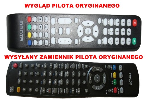 ZAMIENNIK PILOTA ORYGINALNEGO TV LED MANTA PRZEDSTAWIONEGO FOTO [górny pilot z logo MANTA ] pod opisem aukcji . NIE ZASTĘPUJE PILOTÓW O INNYM WYGLĄDZIE LED MANTA OBSŁUGUJĄCYCH RÓWNIEŻ TE SAME MODELE [ inny procesor =inna wersja tj. partia tego samego modelu LED MANTA ] . Dlatego decydując się na zakup UCT-044 bezwarunkowo upewnić się czy telewizor pierwotnie współpracował z pilotem oryginalnym MANTA o wyglądzie -BARDZO WAŻNE .