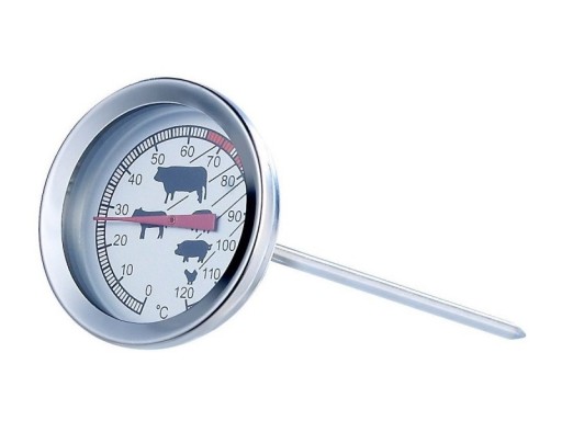 Termometr do pieczenia mięs. Służy do sprawdzania temperatury wewnątrz pieczeni. Z rysunkami zwierząt przy odpowiednich temperaturach.