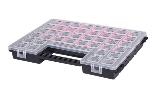 Specjalna konstrukcja pokrywy zabezpiecza przed mieszaniem się przedmiotów między komorami. Przezroczysta pokrywa umożliwia szybkie odszukanie potrzebnych elementów. Organizer posiada poręczny wygodny uchwyt do jej przenoszenia.