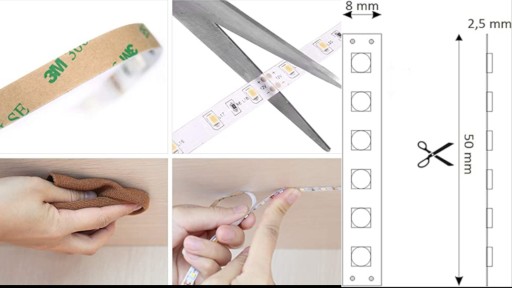 - Taśmy LED posiadają własną samoprzylepną warstwę kleju co ułatwia montaż aczkolwiek zalecamy dodatkowo wzmocnić połączenie taśmy z podłożem dodatkowym klejem szybkoschnącym, silikonem lub innym spoiwem.