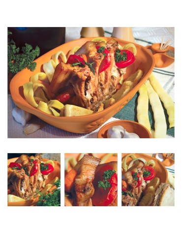 Prezentowany model to w miarę, bardzo praktyczny garnek rzymski pozwalający na przyrządzenia zapiekanek warzywnych i mięsnych, ryb, pieczeni i wielu innych potraw. Idealny do przyrządzenie średniej wielkości kaczki i kurczaka w całości. Wystarczający na przyrządzenie potraw dla 6-8 osób. Znakomity element dekoracyjny stołu dzięki ręcznie zdobionej pokrywie.