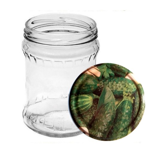 Komplet słoik 500 ml z wieczkiem. Słoik ma zdobione boki co nadaje mu bardzo dekoracyjny charakter. Słoiki spełniają wszelkie potrzebne normy, dzięki czemu mogą mieć kontakt z żywnością.