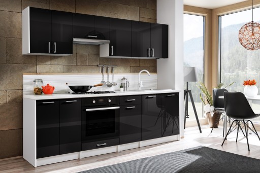 Przedmiotem oferty jest Kuchnia Max z frontami w czarnym połysku o szerokości 240 cm wraz z blatem do wyboru widoczna na zdjęciu poniżej :