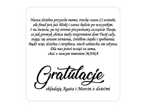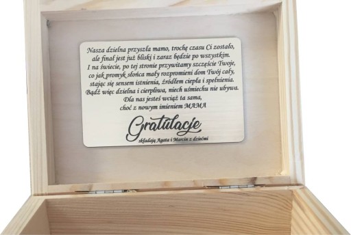 Zaproszeni goście obdarowują młodą mamę prezentami i składają życzenia. Nasza propozycja to skrzyneczka z wygrawerowanymi życzeniami, do której można schować prezencik np. buciki, grzechotkę ...