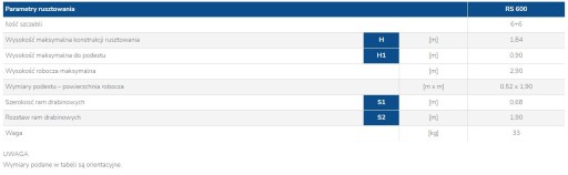 Parametry rusztowania: