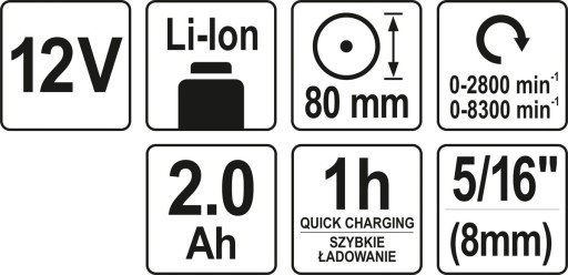 - w zestawie: akumulator 2 Ah YT-82909 i ładowarka 1 h oraz 3 dodatkowe krążki ścierne o różnej twardości (do wosku i pasty)