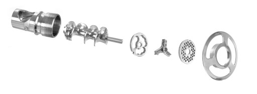 Zespół tnący składa się ze ślimaka, szarpaka, noża oraz sitka z otworami o średnicy 6,5 mm. Wszystkie elementy łatwo zdemontować, co pozwala na ich dokładne umycie.