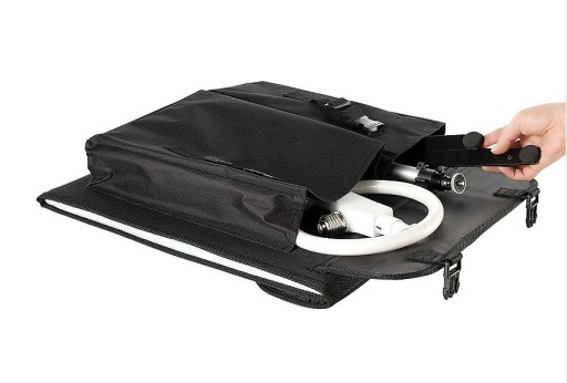 - namiot bezcieniowy - jego pierwszym elementem są dwie ściany zewnętrzne ze srebrną powierzchnią odbijającą, która zatrzymuje światło w namiocie. Kolejne części, to trzy wewnętrzne białe ściany, które równomiernie rozpraszają wpuszczane światło. Tworzą jednocześnie główny szkielet namiotu. Całość zamyka się w zgrabnej walizce, która również jest elementem konstrukcji. Do namiotu dołączone jest dwustronne tło w kolorach: białym i niebieskim. Jego wymiary, to 40x80cm.
