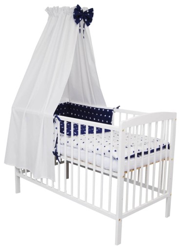 oraz materac, prześcieradełko, kołderka, poduszka, poszewka na kołderkę i poduszkę, ochraniacz na szczebelki, baldachim i wspornik baldachimu.