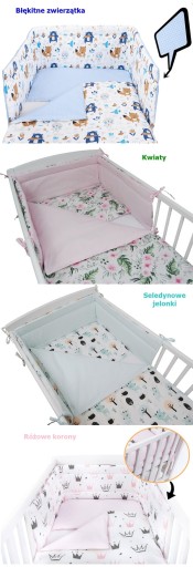 ✅ Skład kompletu: poduszka, kołderka, poszewka na kołderkę i poduszkę, ochraniacz na szczebelki oraz baldachim.