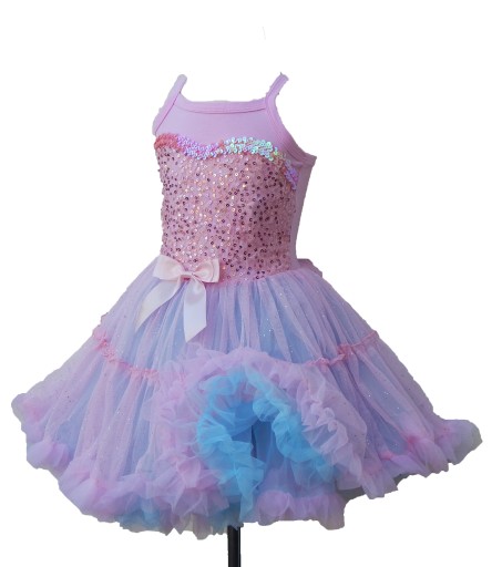 - W pasie kokarda, 3 suto marszczone falbany, zakończone małymi falbaneczkami, pięknie unoszą cały dół sukienki.