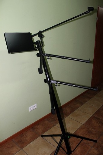 Na wyposazeniu statywu, pulpit na nuty i ramie do przymocowania mikrofonu.