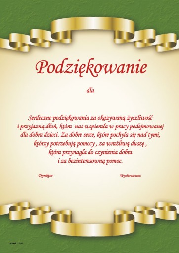 Podziękowanie z wdrukowanym tekstem. Dyplom wykonany z sztywnego kartonu ozdobnego. Format dyplomu - A4. Pełno kolorowy, jednostronny nadruk. Dyplom nadaje się się do personalizacji za pomocą drukarek atramentowych i laserowych, produkt najwyższej jakości. Surowce stosowane do produkcji oferowanych przez nas dyplomów, to najlepsze na rynku kartony ozdobne, gwarantujące najwyższą jakość oferowanych przez nas wyrobów. Nowoczesne technologie poligraficzne, zapewniają estetyczny wygląd Dyplomów oraz pełne bezpieczeństwo w kontakcie z naszymi produktami.