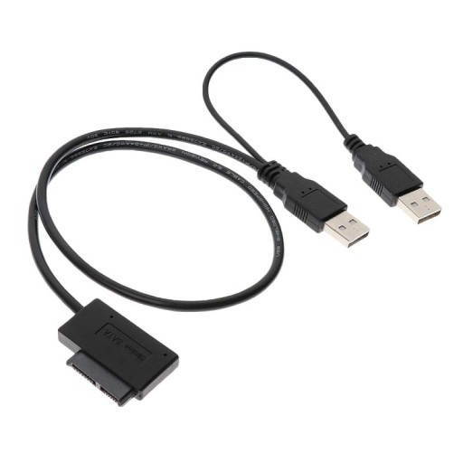 Wysokiej jakości kabel umożliwiający podłączenie napędu DVD/CD z SlimSATA 13PIN do standardowego portu USB. Dzięki zasilaniu z USB nie potrzeba dodatkowego zasilacza. Drugi wtyk USB służy do podłączenia dodatkowego zasilania z portu USB gdy urządzenie potrzebuje większego zasilania.
