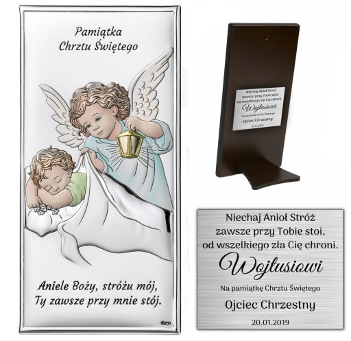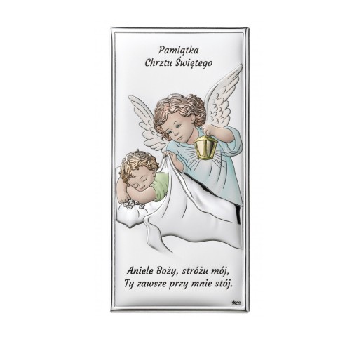 Pamiątka włoskiej firmy przedstawiająca wizerunek Aniołka z latarenką nad dzieciątkiem . Całość została zamknięta w kształcie klasycznego prostokąta z napisem Pamiątka Chrztu Świętego oraz fragmentem modlitwy " Aniele Boży, stróżu mój " Dzięki wkładanej podpórce obrazek możemy umiejscowić na komodzie lub powiesić na ścianie. Świetny pomysł jako pamiątka Chrztu Świętego,