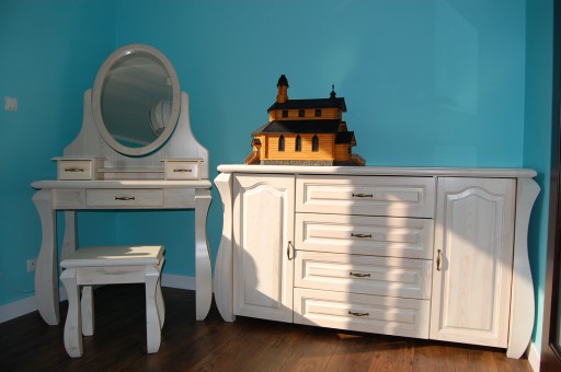- Meble są ręcznie malowane warstą bejcy ,która zabarwia drewno na odpowiedni kolor , następnie są nakładane dwie warsty bezbarwnego lakieru ( półmat)