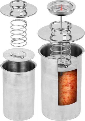 1. SZYNKOWAR 1,5 kg- wykonany ze stali nierdzewnej . Pozwala na przygotowanie do 1,5 kg wyrobu mięsnego jednorazowo. Na środku wieczka znajduje się gniazdo z otworem umożliwiającym bezpośredni pomiar temperatury wsadu mięsnego. Służy do tego termometr.
