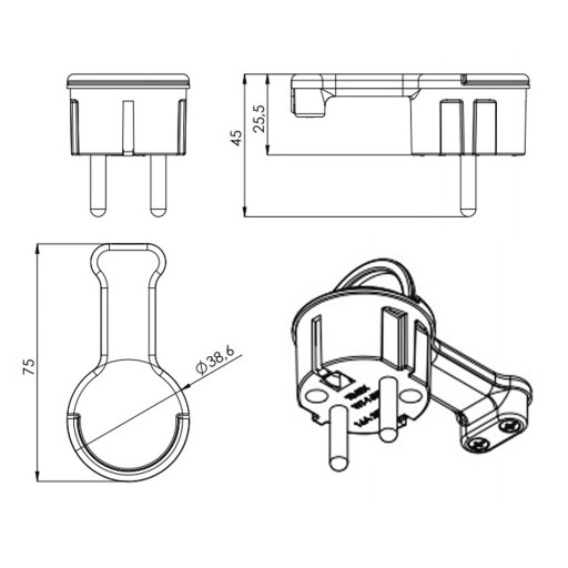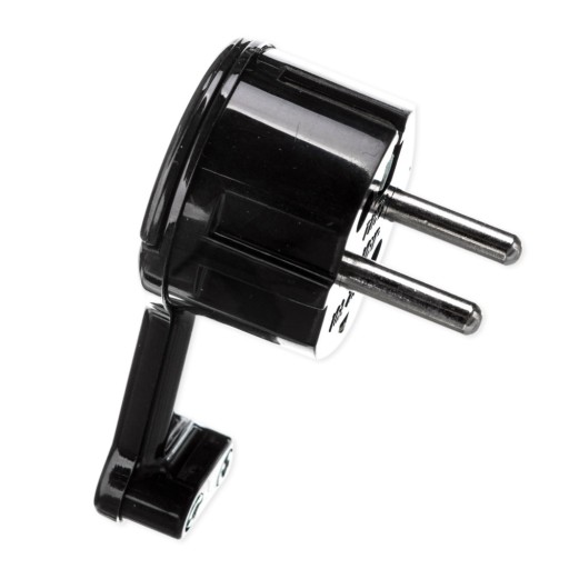Ultracienka wtyczka kątowa. Wtyczka rozbieralna, z uziemieniem (otwór na bolec i schuko). Produkt polski. Wtyczka pasuje do każdego gniazda stosowanego w Polsce (E i F, z uziemieniem i bez). Wtyczka idealna do podłączania urządzeń do gniazda gdzie mamy niewiele wolnej przestrzeni (np. za meblami) - odstaje jedynie 25,5 mm od blatu wtykowego gniazda.