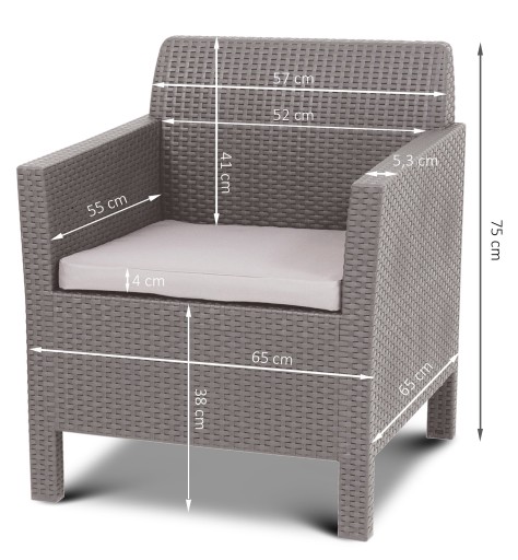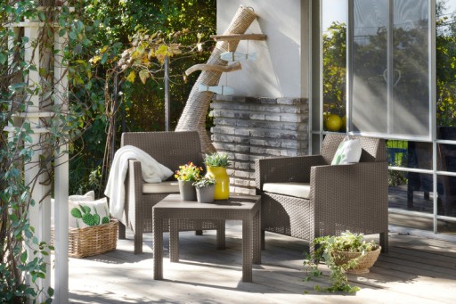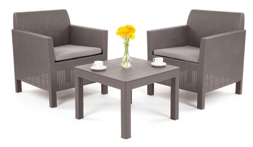 Klasyczny zestaw mebli ogrodowych Orlando weekend to doskonała propozycja dla tych, którzy poszukują stylowych elementów wyposażenia balkonu lub tarasu. Elegancka kolorystyka, prosta forma i ciekawa faktura powierzchni, inspirowana naturalnym splotem rattanowym to główne walory estetyczne produktu. Kompaktowe wymiary oraz łatwy montaż są dodatkowymi zaletami zestawu. W skład zestawu wchodzą dwa fotele oraz kawowy stolik z blatem imitującym deski. Meble wykonane z wysokiej jakości tworzywa są odporne na działanie zewnętrznych czynników oraz promieni UV.