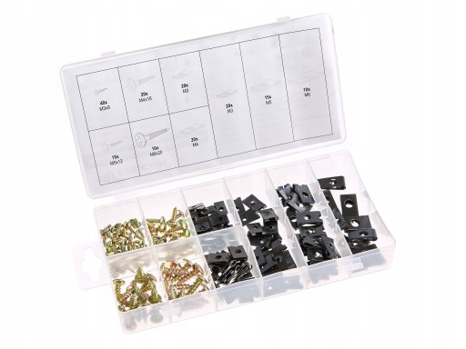 Zestaw składa się z 150 wkrętów i podkładek do karoserii, o rozmiarach od M3x8 mm do M6x20 mm. Wkręty i podkładki umieszczone są w wygodnym sortowniku.