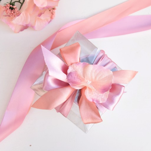 - przezroczyste opakowanie przyozdobione kokardą, sztucznymi kwiatami