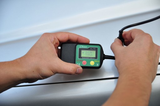 Grubościomierz do pomiarów grubości lakieru na samochodowych blachach stalowych i aluminiowych.