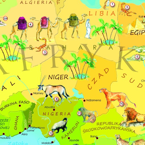 Geograficzna mapa ścienna świata dla dzieci, pełniąca rolę edukacyjną oraz dekoracyjną. Zaznaczono na niej barwnie kontynenty wraz z ukształtowaniem terenu, jak też za pomocą kolorowych piktogramów najbardziej charakterystyczne dla poszczególnych regionów zwierzęta. Dzięki temu mapa jest fascynującym źródłem wiedzy o otaczającej nas fauny. Przekazuje w ciekawy sposób informacje z zakresu geografii oraz przyrody. Pobudza wyobraźnię, zachęca do zdobywania wiedzy i inspiruje. Jest również świetnym pretekstem do spędzania w twórczy sposób wspólnego czasu rodziców z dziećmi. Jakość i estetyka wykonania sprawiają, że stanowi ozdobę dziecinnego pokoju. Pokrycie laminatem zapewnia jej trwałość. Można pisać mazakami ścieralnymi po jej powierzchni bez obawy o uszkodzenie.