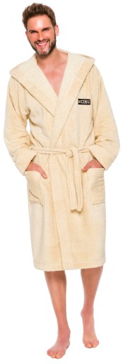 Szlafrok męski z kapturem, wiązany w pasie, z miękkiej dzianiny (soft), na biodrach kieszenie zewnętrzne, na wysokości klatki piersiowej naszyta aplikacja.