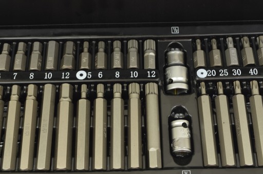 - 19 szt. bitów 30 mm: Torx: T 20, 25, 30, 40, 45, 50, 55; Hex: 4, 5, 6, 7, 8, 10, 12; Spline: 5, 6, 8, 10, 12
