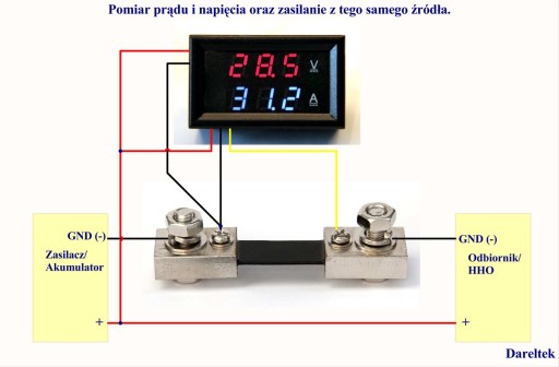Można połączyć oba przewody czerwone. Miernik będzie wtedy mierzył swoje napięcie zasilania, zakres pomiaru i zasilania 3,5V do 30V.