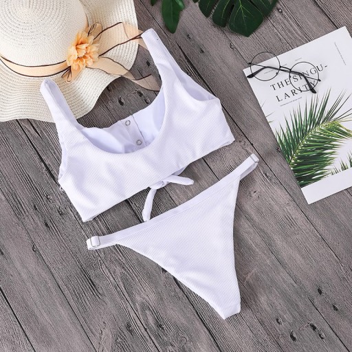 Kobiecy i niezwykle seksowny komplet kąpielowy składający się z topu oraz wyciętych majteczek z regulacją po bokach.