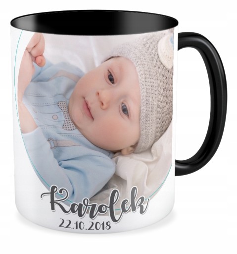 Czarne elementy kubka to jego uchwyt i środek. Pozostałe elementy, w tym miejsce w którym nakładana jest grafika, są w kolorze białym.