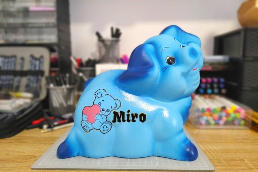 Teksty oraz proste grafiki umieszczamy na skarbonkach ręcznie, markerami do ceramiki lub przenosimy na skarbonkę metodą termotransferu.